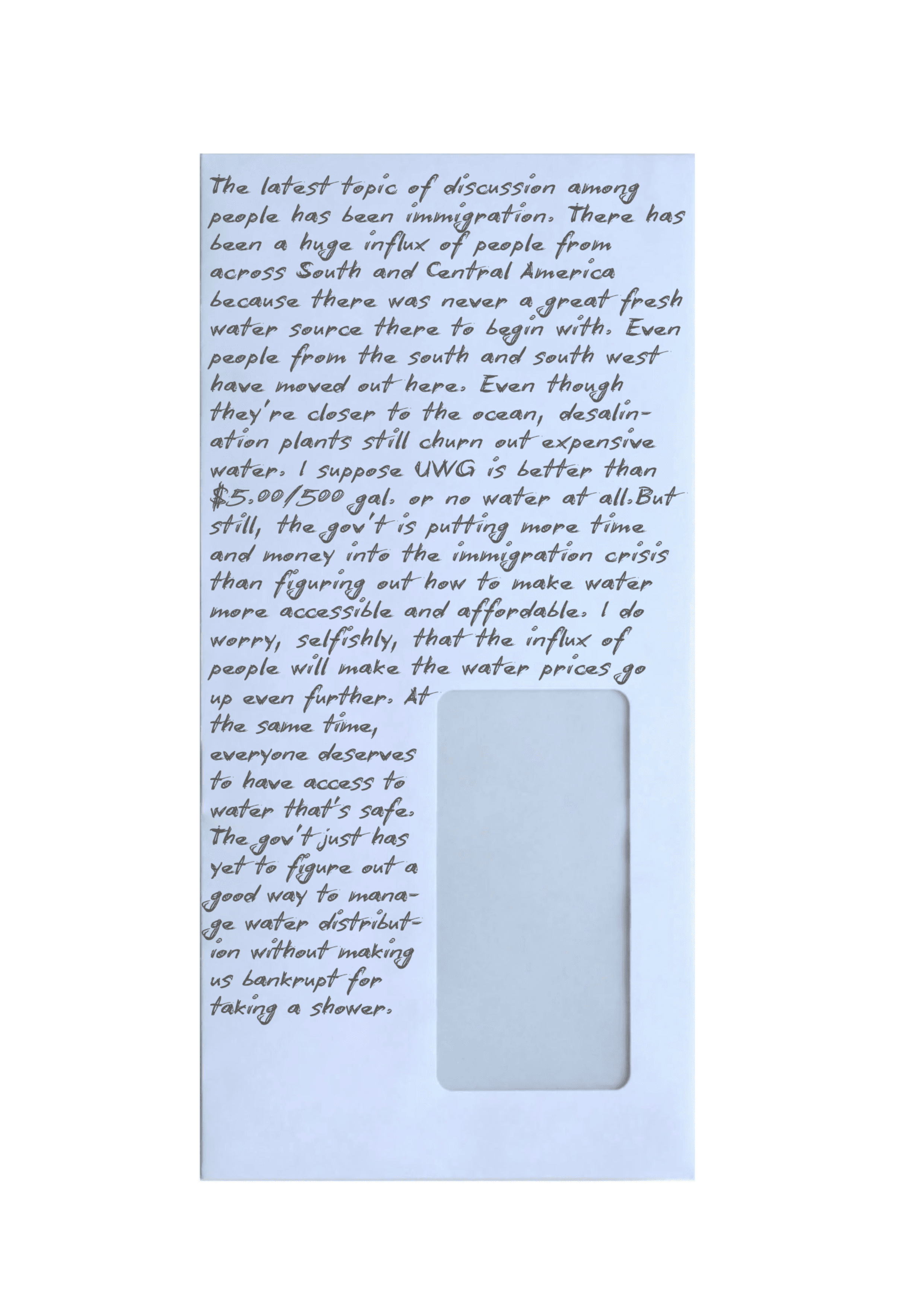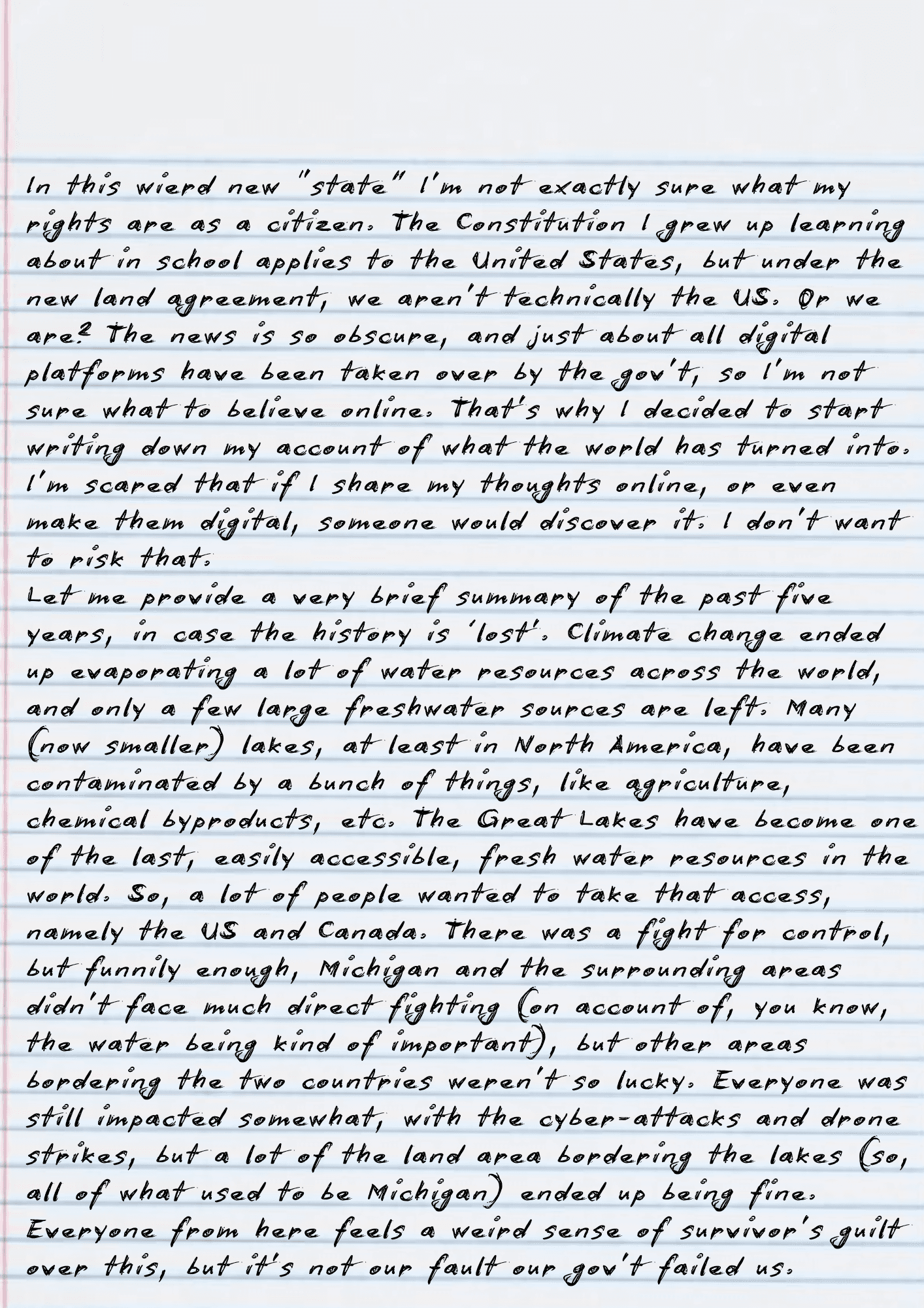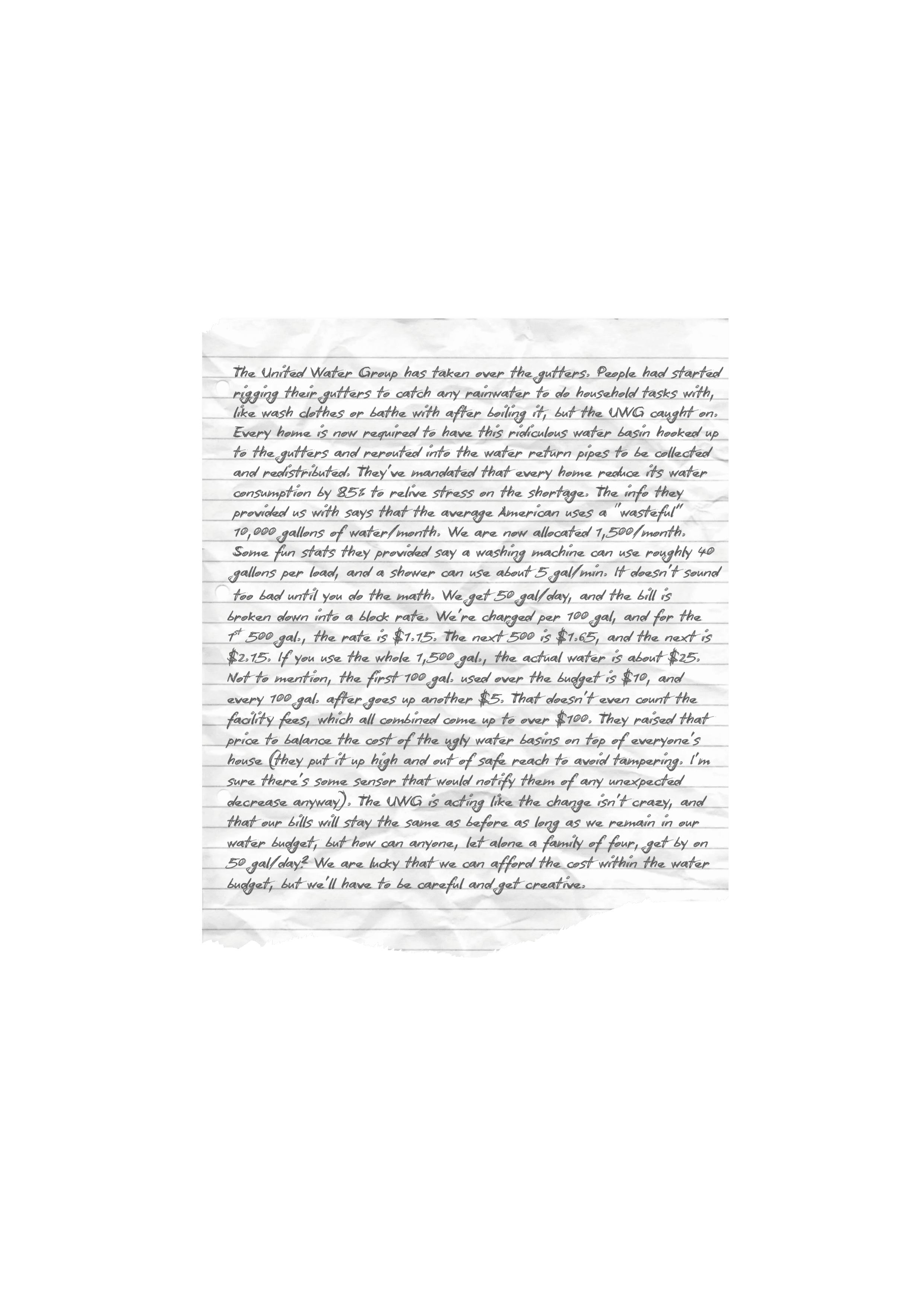 This is the account of an unnamed individual who grew up and lived in the State of Michigan before and after the Water Wars. They bravely created a paper history, documenting the impacts that the government and the United Water Group (UWG) had on society. These are a few select artifacts from their collection.