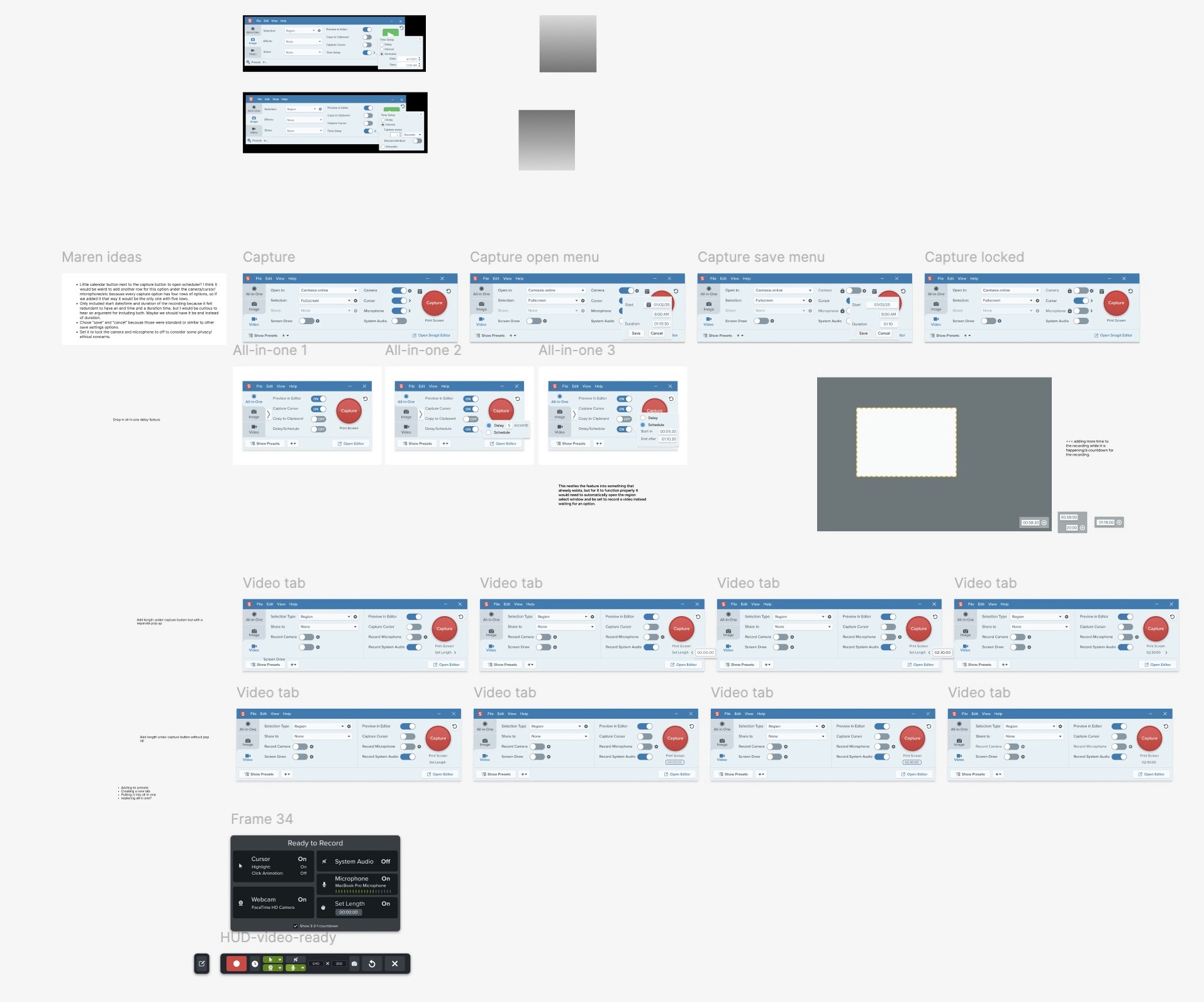 After completing those first sketches, I worked in Figma to begin designing how the feature and its workflows would fit into the existing software. I determined three key states the feature would need to be accessed in, the capture window, the HUD, and during recording, and shared these designs with my team to get their feedback.